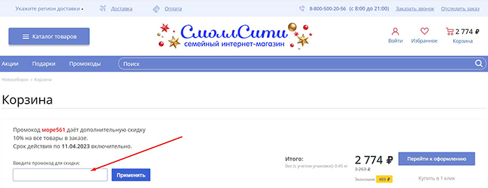 Обратите внимание: большинство промокодов, которые действуют в магазине СмоллСити, суммируются с существующими скидками. Более того, если вы забыли проверить наличие промокодов, информация о последних предложениях появляется автоматически в Корзине. Для получения скидки вам останется только ввести символы в пустое поле и нажать кнопку «Применить».