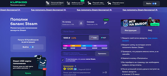 У нас на сайте вы найдете промокоды, которые помогут сэкономить на оплате услуг сервиса Steam.kupikod.com. Хотя условия, которые он предлагают, выгоднее, чем у ряда конкурентов, все-таки комиссия остается довольно высокой. Поэтому рекомендуем пользоваться промокодами для дополнительной скидки.