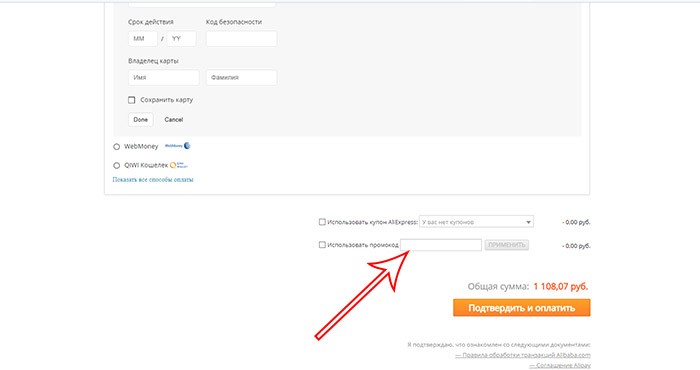 После того, как в корзине окажутся все желаемые товары, можно перейти к оформлению. На первой странице формы есть возможность подключить акции магазина – купоны, которые можно получить, совершая покупки. На следующей необходимо вписать личные данные, необходимые для доставки товара, а также именно здесь есть специальное поле, куда нужно ввести промокод: