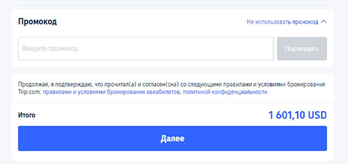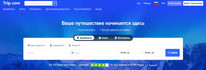 Онлайн-платформа Трип является частью Trip.com Group. Это отличный сервис, благодаря которому можно легко подобрать выгодные авиабилеты, найти номер в гостинице или купить билеты на поезд. Среди предложений легко выбрать подходящее по бюджету. Но на этом достоинства сайта не заканчиваются. Постоянных клиентов ждет программа лояльности, а главное – всегда можно воспользоваться промокодом и получить весомую скидку.