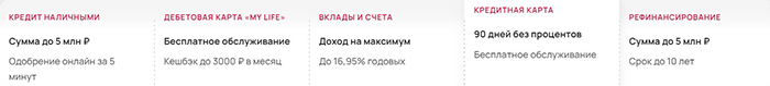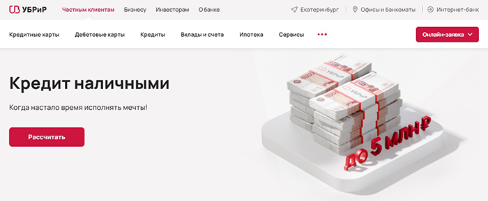 В каждой категории представлено несколько продуктов с разными условиями. Например, на официальном сайте банка Ubrr.ru можно оформить кредит на сумму до 5 млн наличными, при этом процесс обработки заявки займет не более 5 минут. При использовании дебетовой карты с бесплатным обслуживанием можно рассчитывать на кэшбэк до 3000 в месяц, а открытии вклада – до 16.95% годовых. Также у банка есть программа рефинансирования сроком до 10 лет на сумму до 5 млн.