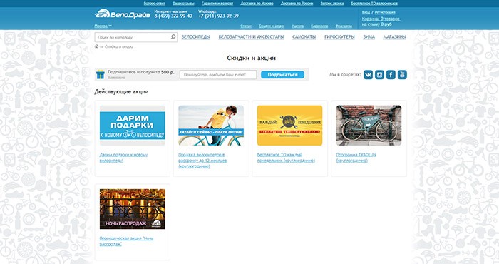 Если тебя интересуют выгодные покупки, Велодрайв подготовил массу подходящих предложений. Например, в магазине действуют подарочные сертификаты, которыми можно оплачивать товары. Кроме того, работает и дисконтная программа для постоянных покупателей, что очень удобно. Есть специальный раздел, в котором собраны товары, предлагаемые по акциям или же со значительными скидками. Если хочется чего-то совсем бюджетного, то имеется комиссионный магазин, а если нужна техника на небольшой период времени, то ее можно тут же взять напрокат.