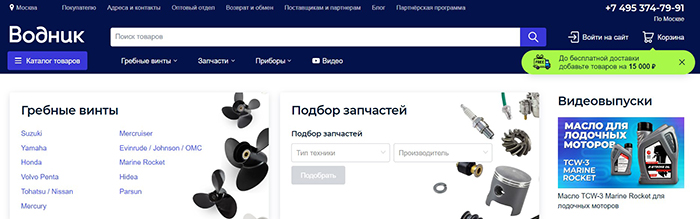 Доставка заказов суммой свыше 15 000 рублей бесплатна. Акция действует по всей территории России, но не касается крупногабаритных отправлений, а также ряда товаров – надувных лодок, прицепов, мотобуксировщиков (полный список исключений представлен на сайте). Товары, которые могут быть доставлены бесплатно, отмечены значком «Бесплатная доставка».