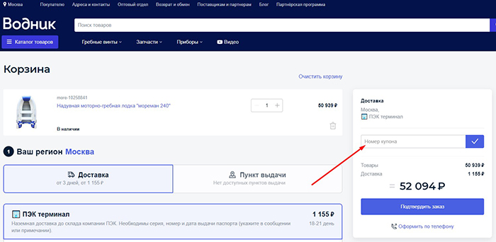 Пользоваться промокодами для получения скидки в интернет-магазине Водник очень просто. Для этого нужно выбрать подходящий купон: они отличаются сроком действия и условиями активации. Так, некоторые промо-коды могут быть использованы при совершении покупку на сумму не ниже пороговой суммы или при заказе определенных категорий товаров.