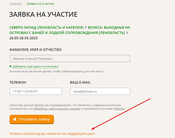 На этом этапе вводить промокод не нужно, только перед внесением предоплаты. После подачи заявки с вами свяжется координатор и объяснит, как перевести деньги.