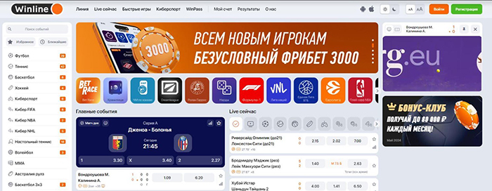 На главной странице Winline.ru вы найдете множество рекламных баннеров и ссылок на мобильные приложения, чат поддержки, специальные ставки и акции. Здесь же расположена информация о событиях, для которых ведется видеотрансляция. Пользователь может выбрать светлую или темную тему интерфейса, нажав кнопку на верхней панели.