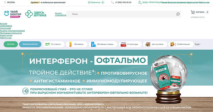 Онлайн-аптека работает с учетом действующего законодательства РФ. Это значит, что она может доставлять рецептурные лекарственные средства, медицинскую технику, лечебную косметику, БАДы, и прочие товары аптечного ассортимента. Рецептурные лекарства и те, которые требуют прохладного хранения, отпускаются только через розничные аптеки.