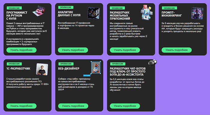 Зерокодер уделяет большое внимание перспективным направлениям в IT – например, нейросетям, разработке no-code или веб-дизайну. Программа построена таким образом, что позволяет студентам получить востребованные навыки без глубокого погружения в код.