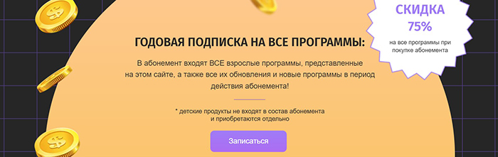 Существенно сократить стоимость обучения на платформе Zerocoder.ru можно с помощью покупки годового абонемента. Он дает доступ ко всем программам, за исключением курсов для детей, со скидкой до 75%. Абонементов несколько: можно выбрать самый дешевый базовый тариф или получить доступ к дополнительным опциям за небольшую доплату. Если планируете использовать возможности сервиса для развития собственного бизнеса, обратите внимание на подписку Бизнес: она предоставляет доступ к закрытому чату с заказами, так что затраты со временем окупятся.