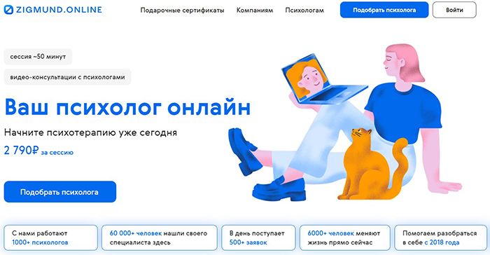 Зигмунд Онлайн – сервис, который помогает найти психолога для онлайн-сессий. Общение со специалистом проходит в видеочате: считается что такой формат не уступает по эффективности личному общению. Цена на любую сессию фиксированная – чуть меньше 2800 рублей. Но если использовать промокоды, которые размещены на нашем сайте, можно получить неплохую скидку при оформлении заказа на Zigmund.online.