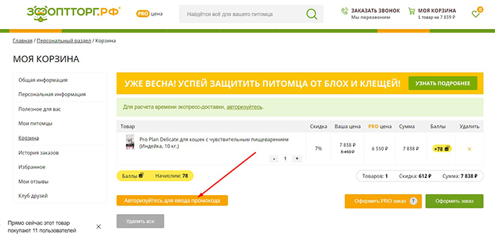Максимально понятный каталог на сайте и система поиска помогут быстро сориентироваться в ассортименте и выбрать необходимые товары. Как только они окажутся в Корзине, можно приступать к оформлению. В первую очередь вы заметите оранжевое поле «Авторизуйтесь для ввода промокода». Регистрация на сайте полезна и выгодна для клиентов, поэтому не упускайте эту возможность сэкономить.